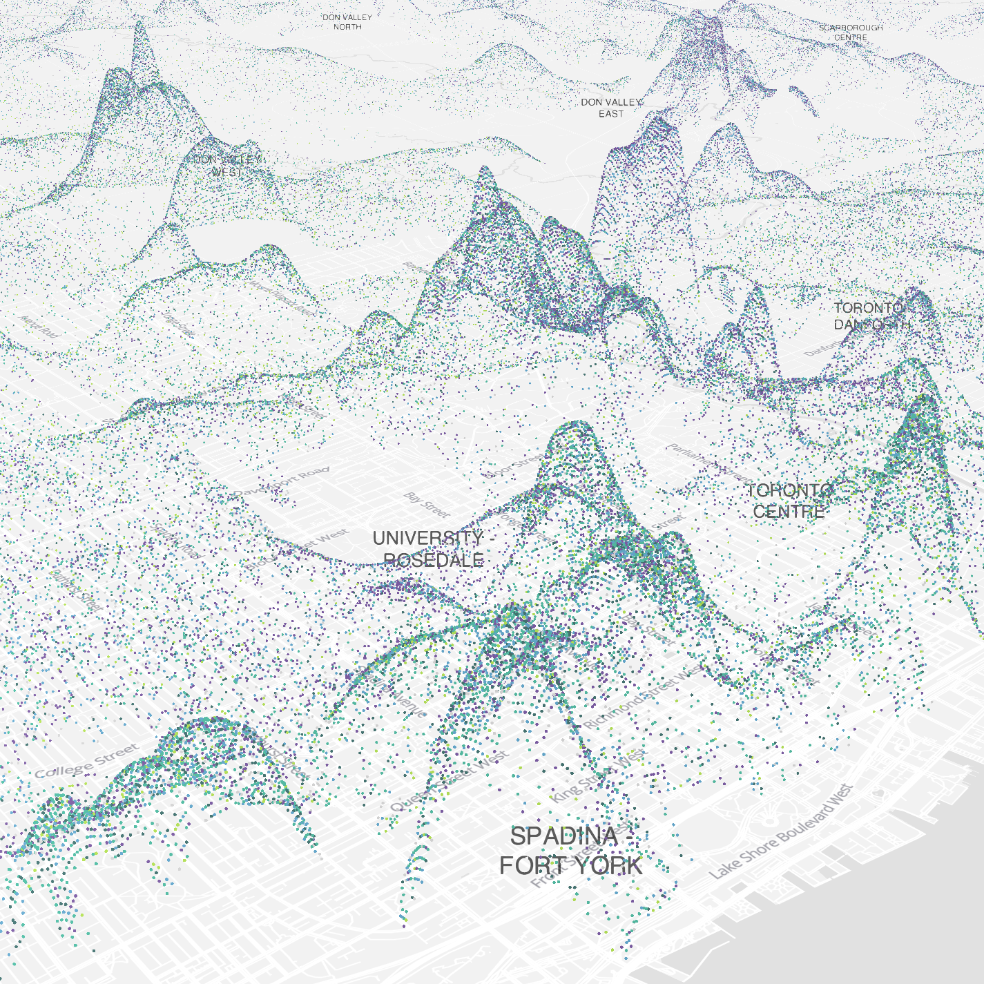 Dot density map for Toronto, Canada, visualizing population density in 3D by rendering dots as a point cloud layer.